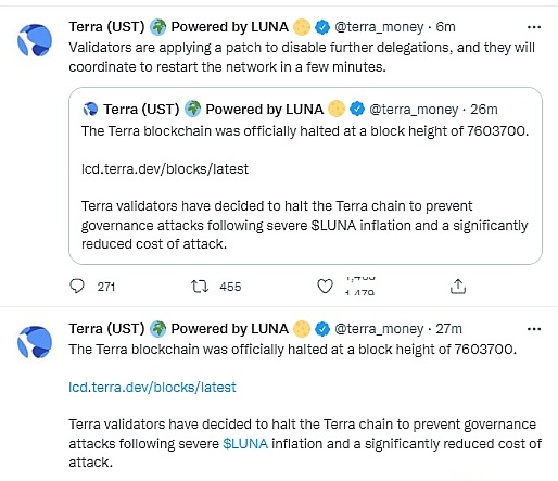 到目前为止,加密市场中多方都在寻找方法,尝试着尽可能的止损和抑制破坏。Terra官方发文表示,Terra 区块链已经在区块高度7603700处暂停。Terra验证者已决定停止Terra链,以防止LUNA严重通货膨胀和显著降低的攻击成本之后发生治理攻击。