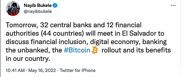 看起来萨尔瓦多这样勇敢的尝试,到目前为止并没有带来预期的经济利益或者其他名誉上的进展。对此,5月16日纳伊布发文表示,明日32个中央银行和12个金融当局(44个国家)将在萨尔瓦多举行会议,讨论金融包容性、数字经济、无银行业务的银行业务、比特币的推广及比特币在本国的好处,试图从中找到破局的可能。